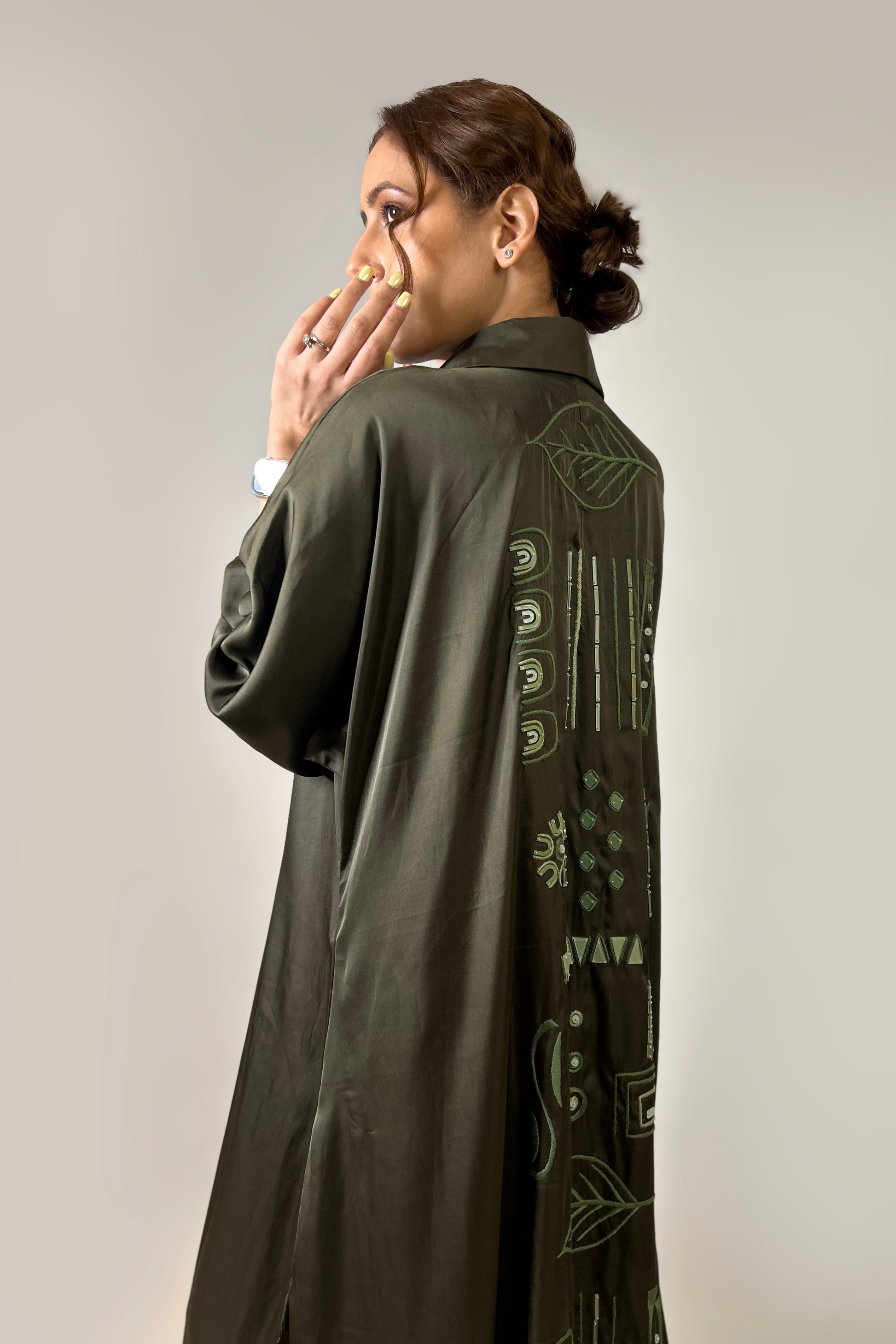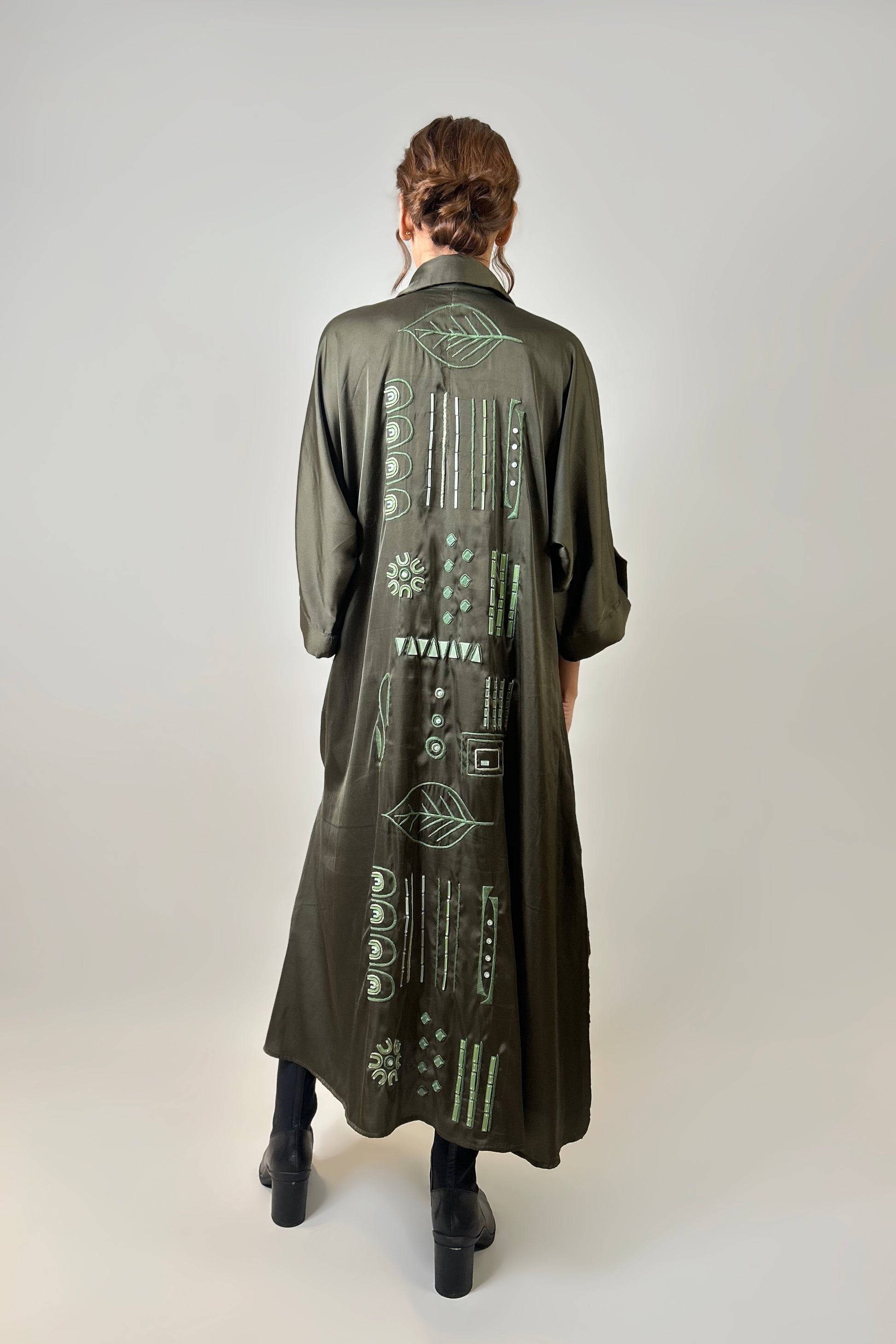 A flowing expression of free-spirited elegance, the Breakaway Kaftan is crafted in soft, breathable fabric for effortless movement. The back features Tribal Echo embroidery—a rhythmic interplay of geometric and organic motifs, reminiscent of ancestral artistry and bohemian charm. Designed for versatility, this relaxed silhouette drapes beautifully, making it a perfect choice for both casual layering and statement styling.