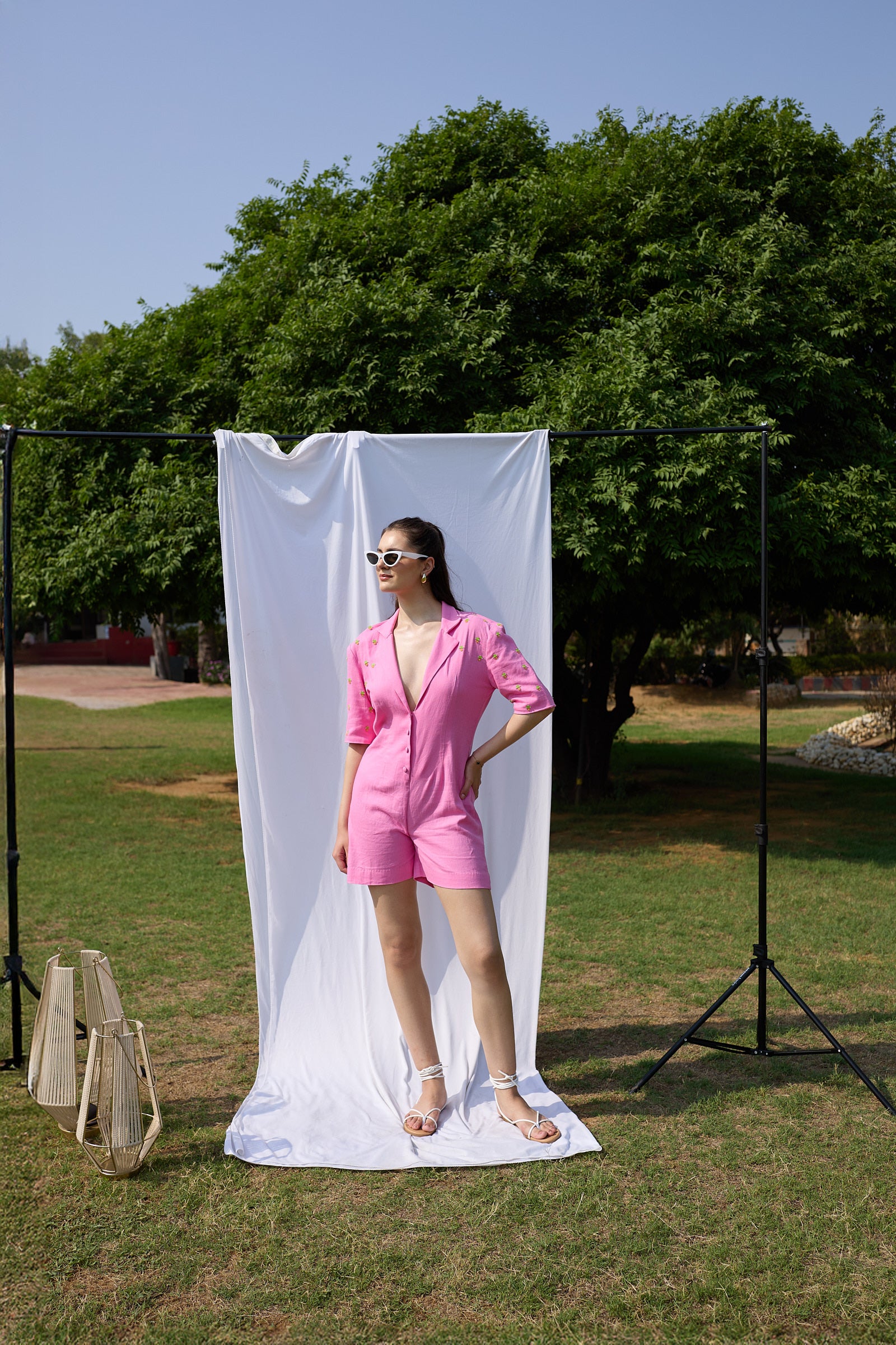 The Popsicle Jumpsuit is a relaxed-fit playsuit in bright bubblegum pink, tailored with sharp shoulders, elbow-length sleeves, and a clean button-down front. Hand-embroidered green tree motifs run across the sleeves—adding a playful, standout texture to this breezy silhouette.