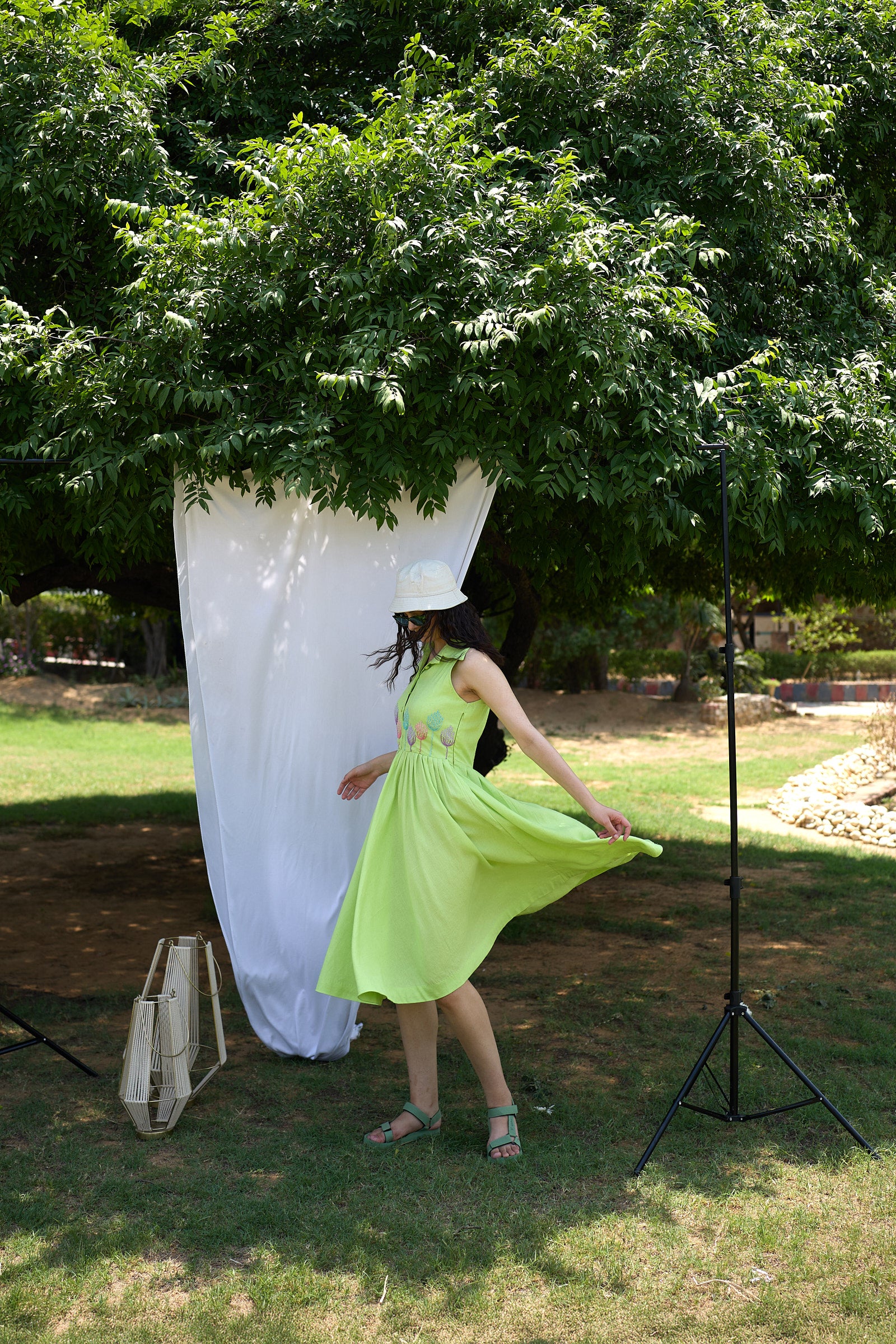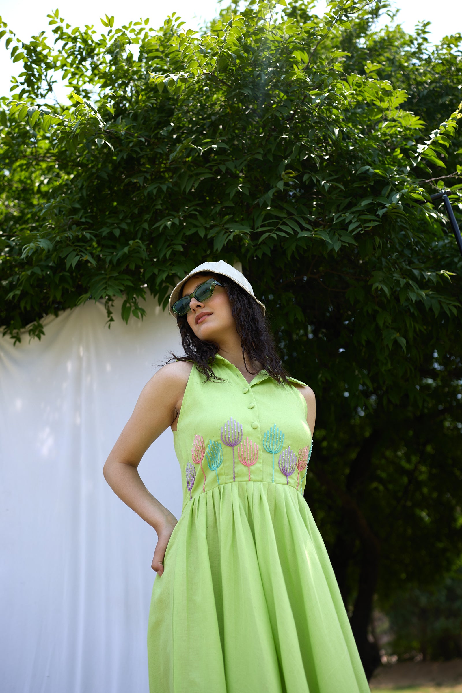 The Sugar Rush Shirt Dress is a sleeveless, collared midi in a bright matcha green. The structured bodice with visible buttons opens into a softly gathered skirt for an easy, flattering fit. Embroidered flowers in cassata-inspired colors run along the waistline—adding a burst of playful contrast to the solid base.
