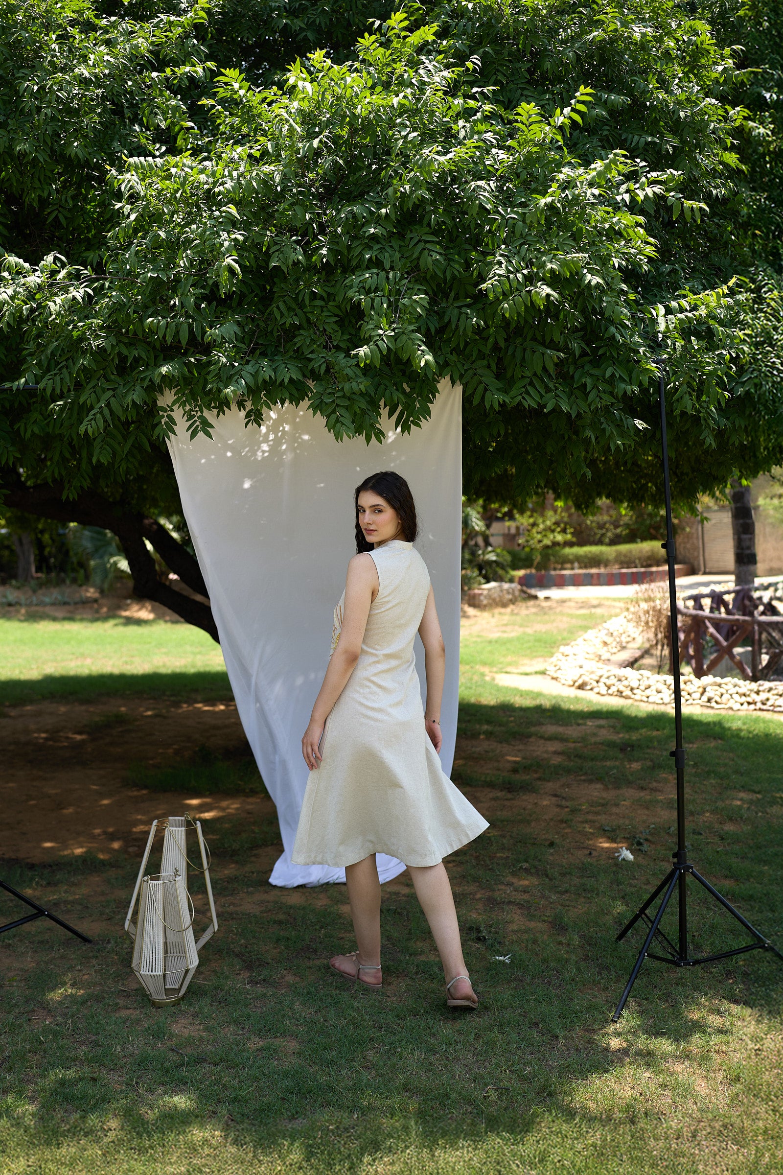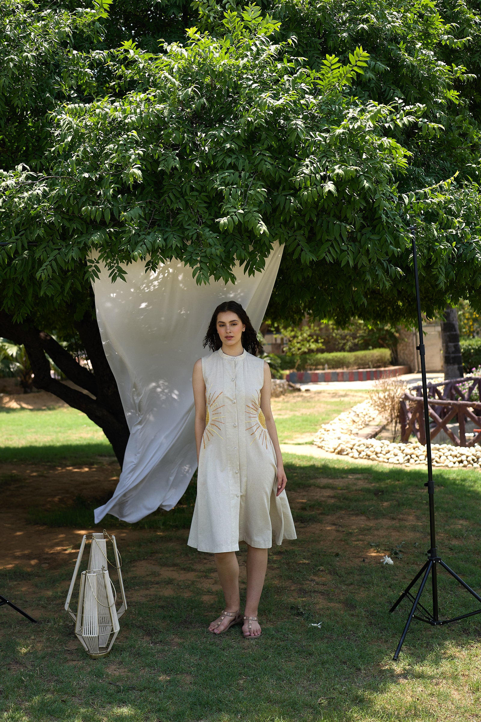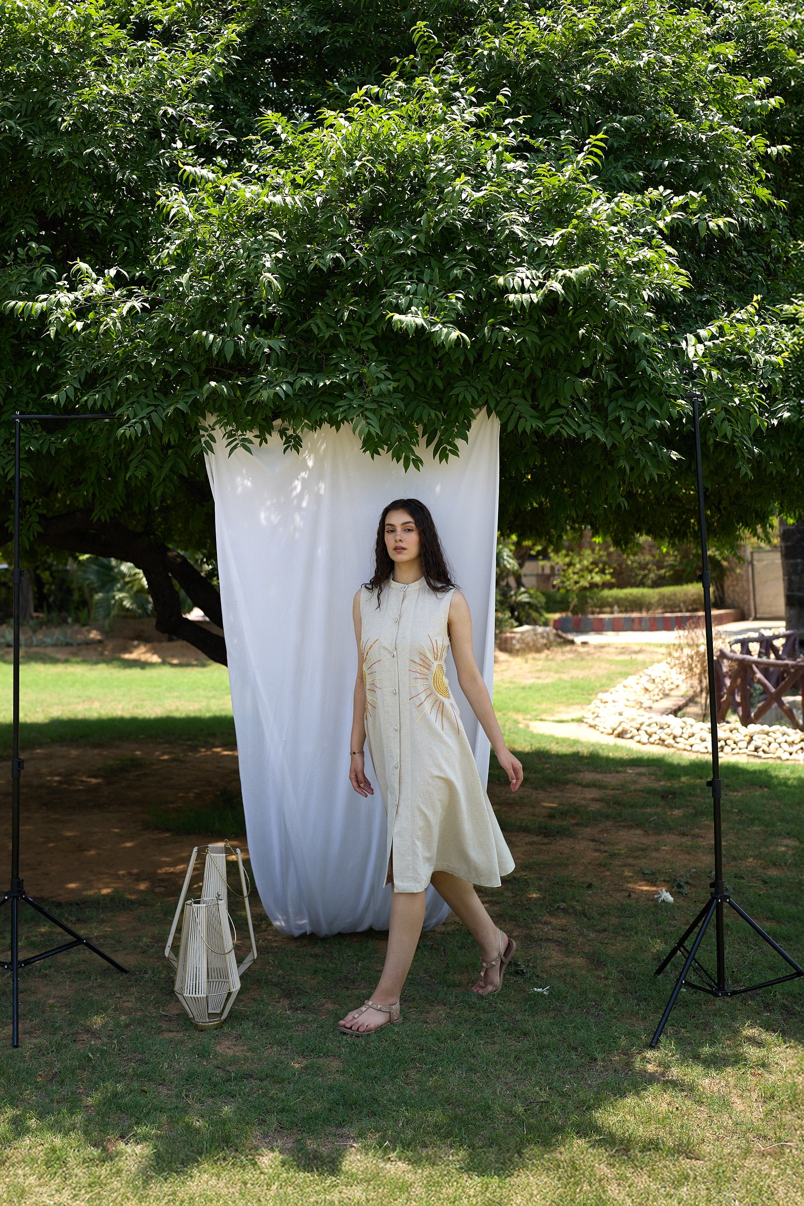 The Sun Kissed Shirt Dress is a sleeveless midi in a soft cookie cream color that brings ease and elegance to summer dressing. Designed with a structured A-line silhouette, it features a button-down front and a clean high collar. The standout detail is the sun embroidery on either side, done in soft cassata-inspired tones that bring subtle contrast and depth to the cookie cream base.