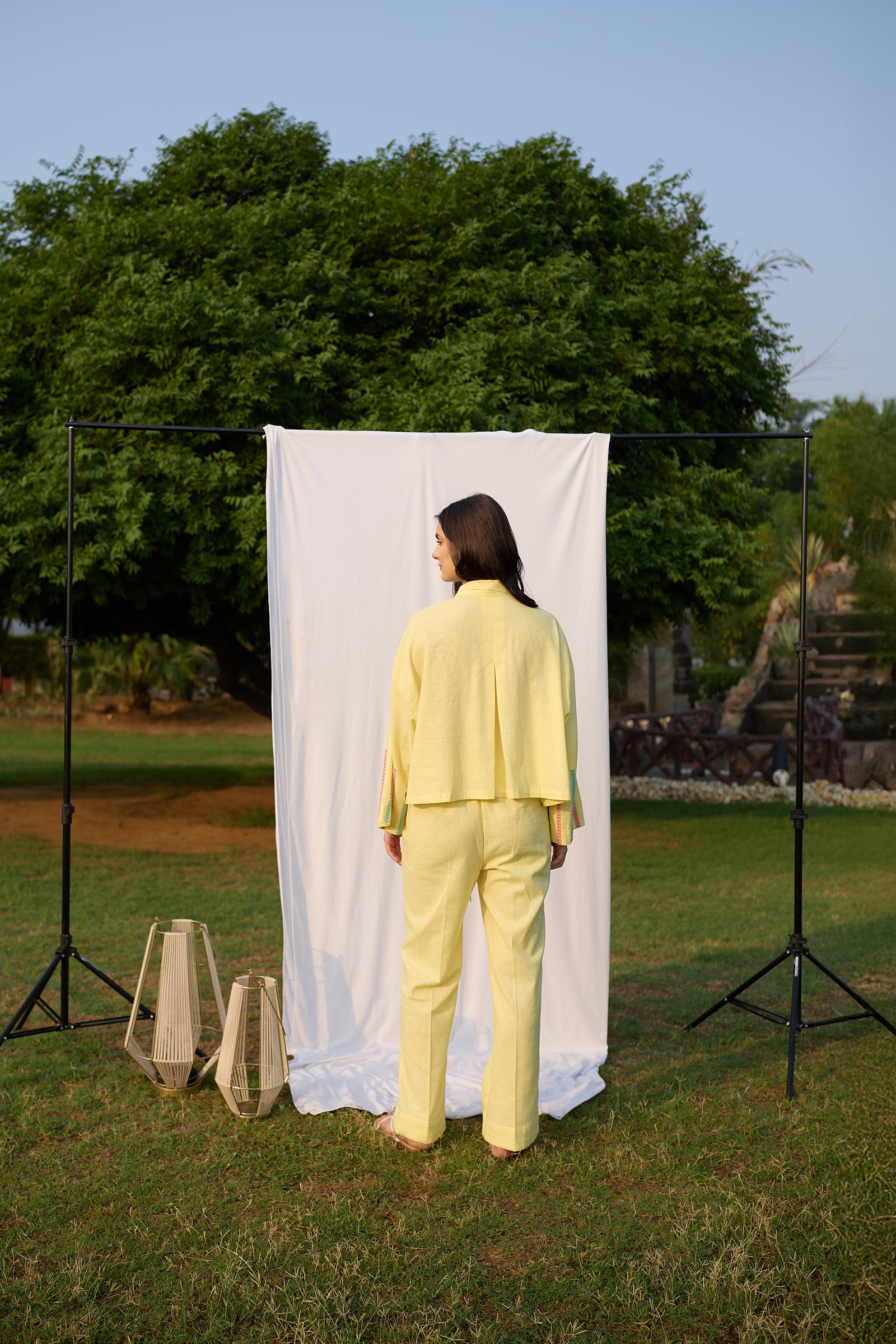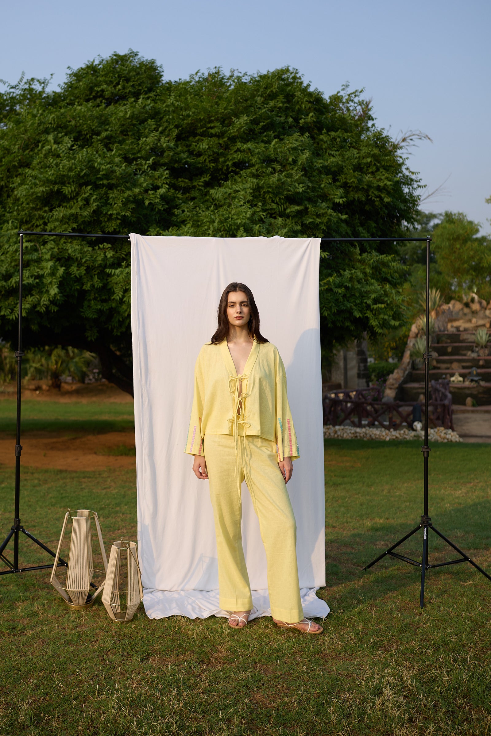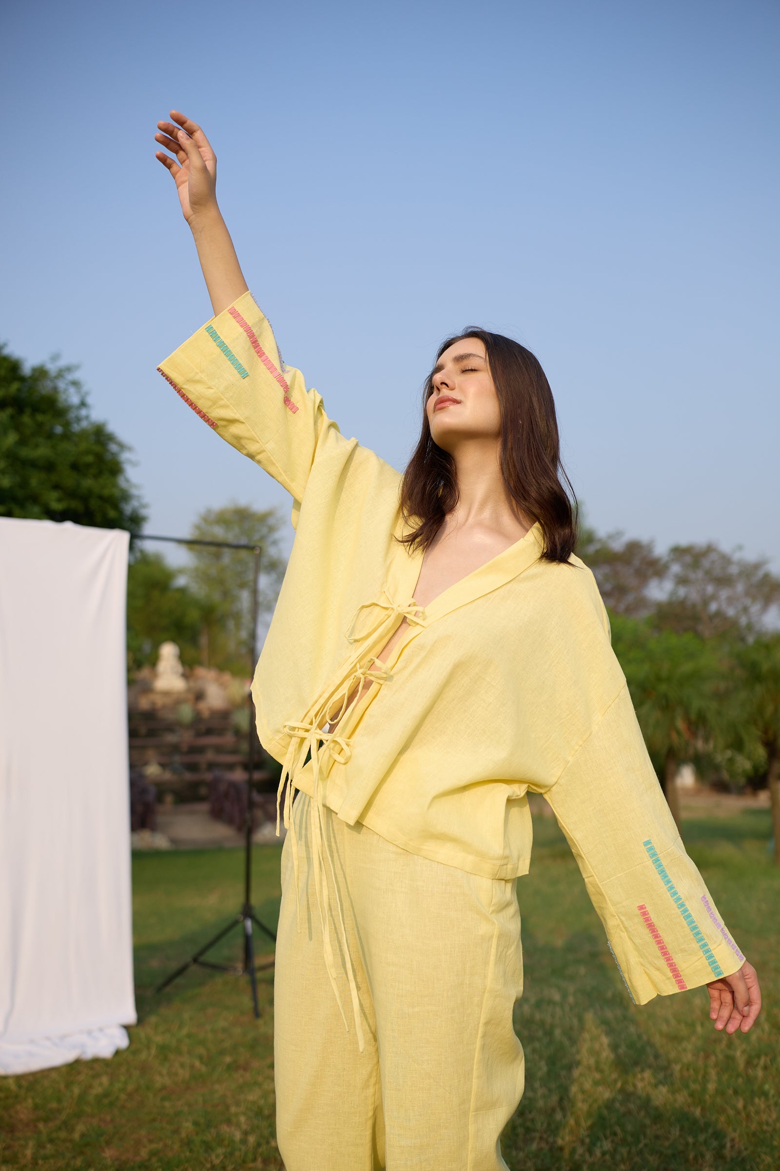 Cut in butter yellow, the Sunny Scoop Set pairs a relaxed tie-up shirt with straight trousers. The breezy top features wide sleeves and tie-up details, offering a laid-back yet elevated feel. Along the sleeves, dotted multicolor embroidery inspired by cassata sprinkles adds a delightful pop of pastel, evoking the joyful spirit of summer treats.