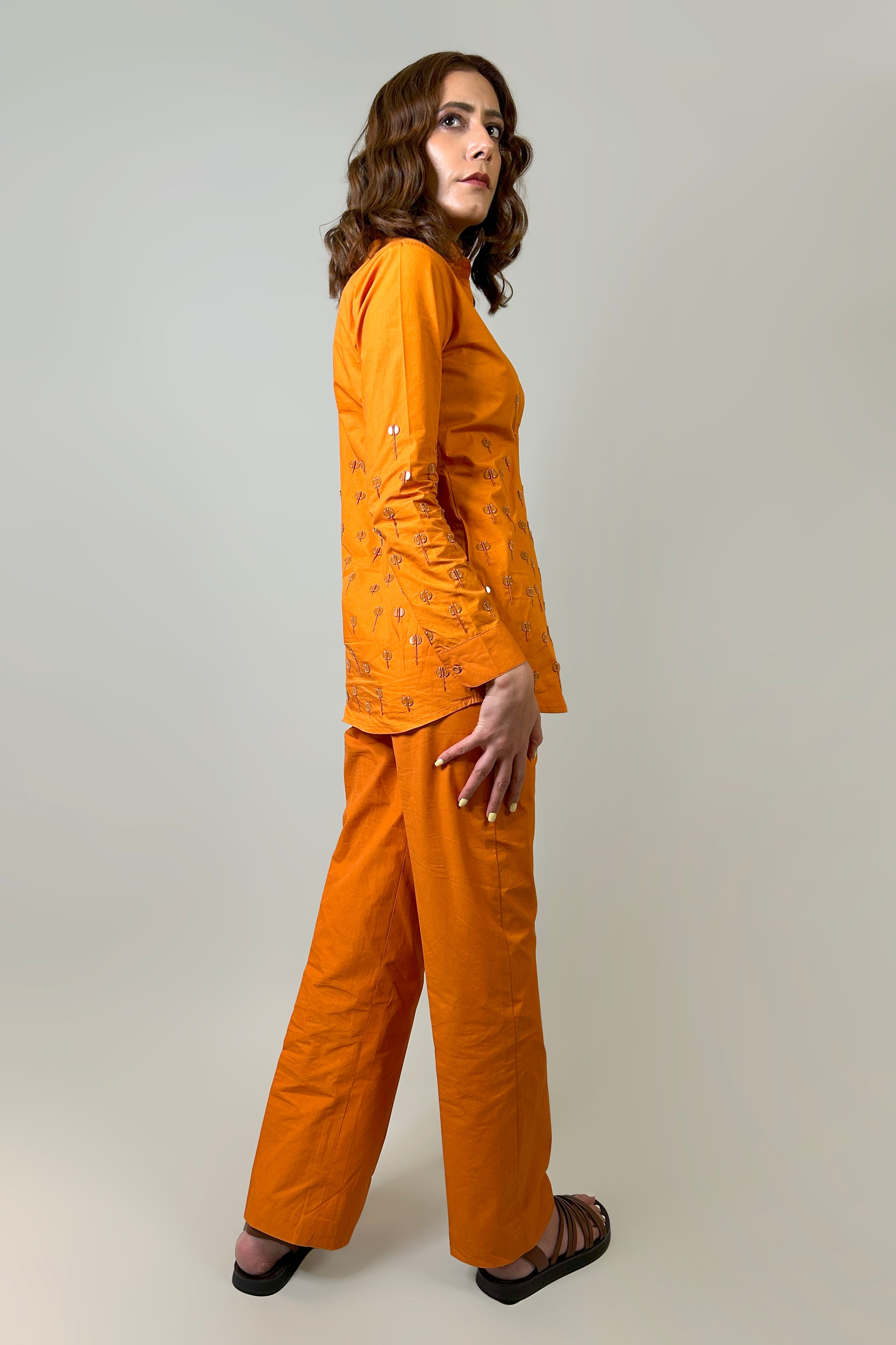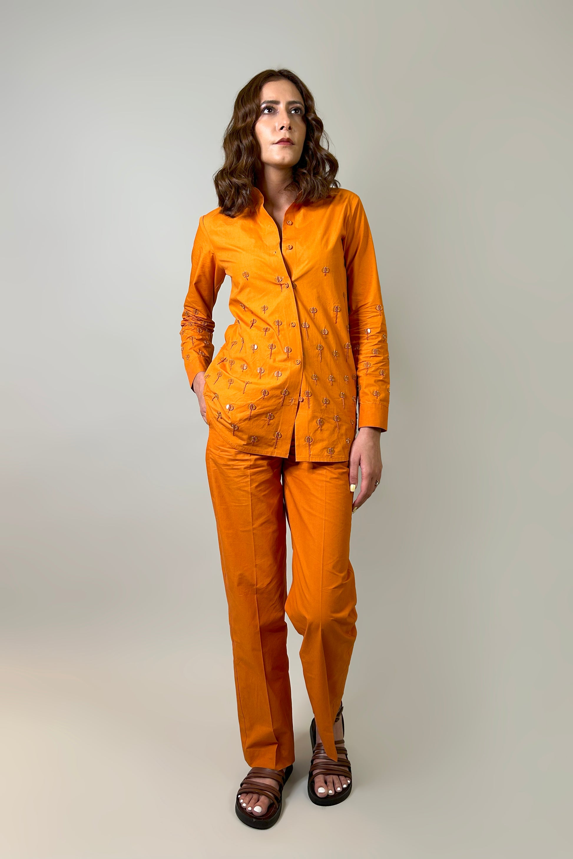 The Table Talk Set is all about style and ease. Made from 100% breathable cotton, this relaxed-fit set is designed for comfort without compromising on elegance. The button-up shirt features the Bloom embroidery pattern, adding a subtle yet striking detail across the fabric. With its easy silhouette and airy feel, it's perfect for casual outings, workdays, or slow mornings at home. The straight-leg trousers complete the look, making this set a versatile wardrobe essential.